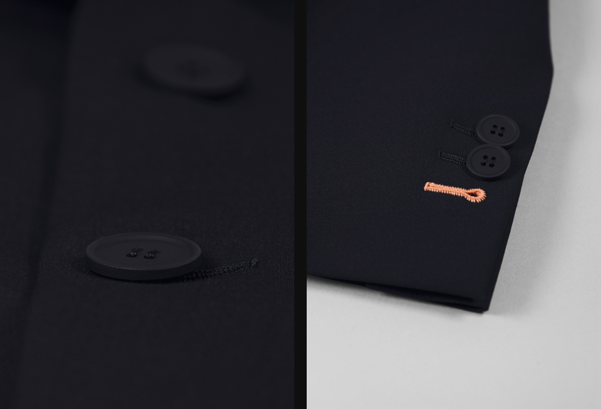 · Handsewn buttonholes with contrasting colour in orange on cuffs and lapel
