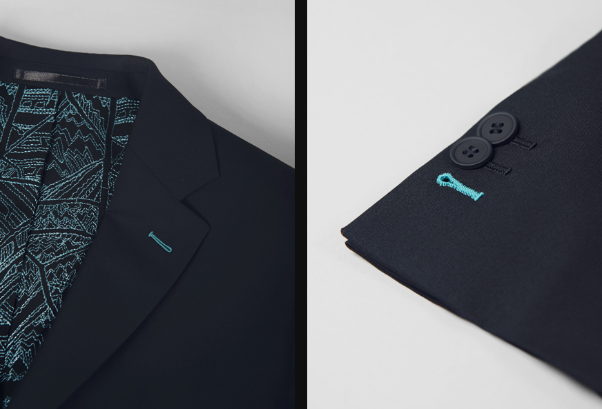 · Handsewn buttonholes with contrasting colour in petrol on cuffs and lapel